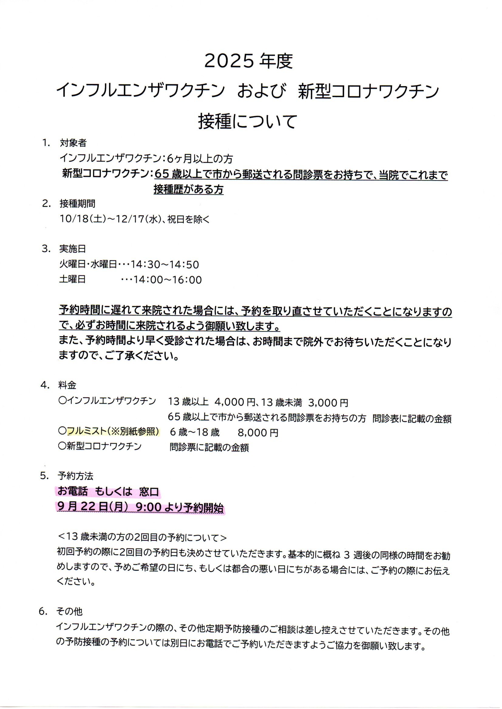 10/18~12/20までの土曜日は、インフルエンザワクチン接種のため、受付終了が12:00となります。
